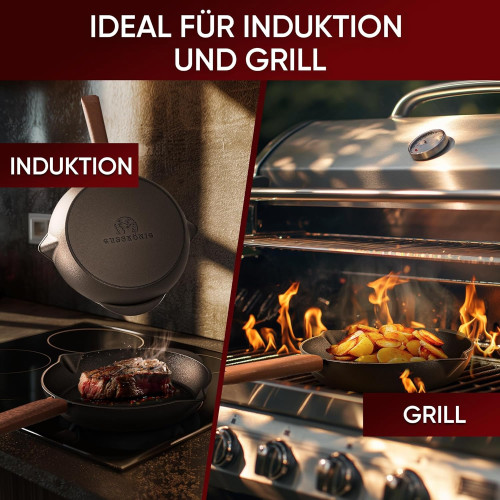 - Термостійкість до 300°C Чавунна пательня Gusskönig витримує температури до 300°C без деформації, що робить її надійною для будь-яких кулінарних викликів.